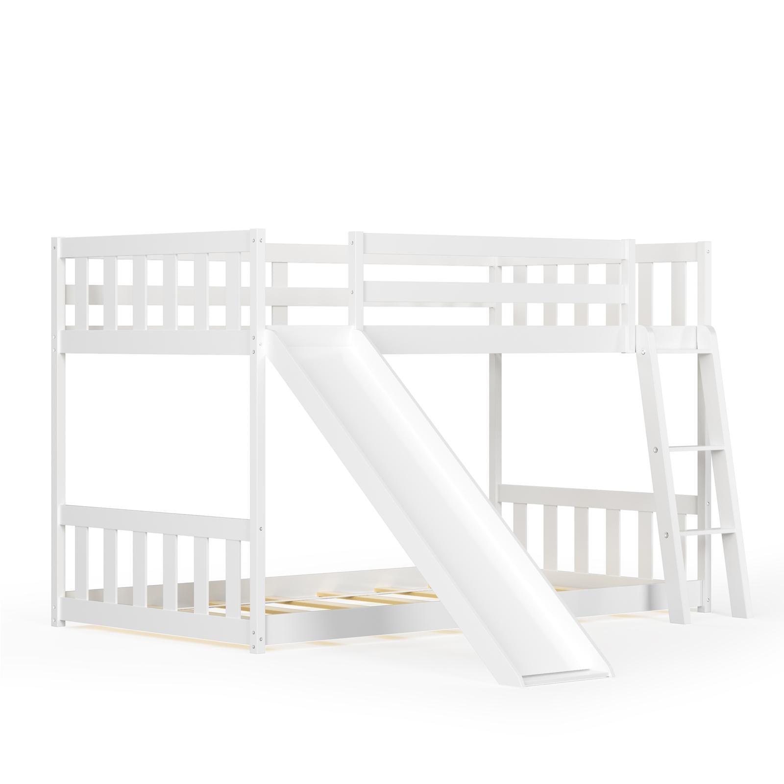This twin over twin bunk bed brings safety and fun to the children. With the height of 51'', this space-saving floor bunk bed is great for smaller rooms. The solid pine wood frame is durable and stable to last for rough play. The bottom bunk is the perfect sleeping space for the younger kid. The top bunk features tall 12" guardrails, so the bed fits standard mattress sizes no more than 8". The slide is included to bring fun to the children and can be put either left or right. Also the ladder with rounded edges offers comfortable, easy climbing. This modern bunk bed matches any style of home decor.