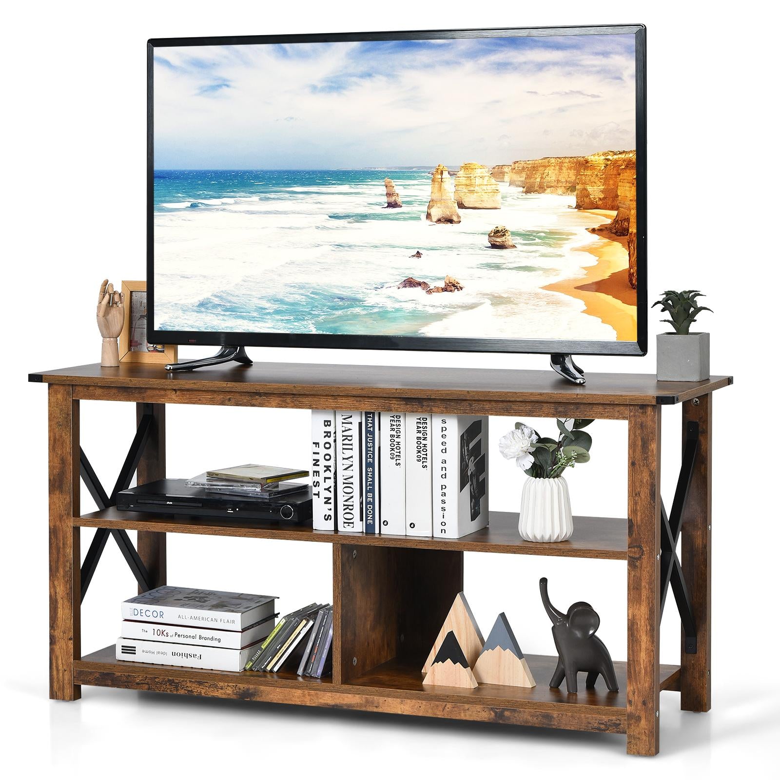 Our TV cabinet is composed of three layers of open shelves, so it has enough space to store your game consoles, DVDs and books and is easy to access. The spacious table top is made of high-quality MDF board, which provides enough support and can bear a weight of 110 pounds. The design of the management cable solves the mess caused by multiple lines, so that the entire desktop is neat and orderly. The retro wood textured surface makes it match well with any home interior decorations, giving you different visual enjoyment to decorate your living room, study room and bedroom. If you are looking for a TV stand, then it would be wise to choose our three layers of open shelves entertainment center.